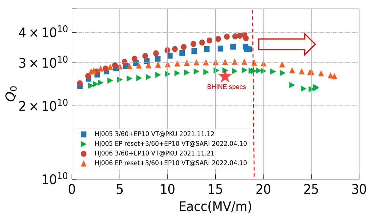 3月中旬以来,模组团队共完成10多腔次1.3GHz超导腔垂直测试。其中,由高研院与哈尔滨工业大学合作研制的两支1.3GHz 9-cell超导高频腔于3月初开始在无锡超导腔表面处理平台完成了电化学抛光、掺氮等优化表面处理,于3月31日顺利获得疫情期间特别通道由上海三井公司中转运送至上海光源园区,并于4月10日和4月25日分别完成两轮2K垂直测试。经模组测试团队和液氦低温团队的通力合作,在快速降温中超导腔顶底最大温差首次达到85K以上,为超导铌腔高效磁通排除创造了条件。经测试,两支超导腔均在保持高品质因数的同时,最大加速梯度取得突破,分别达到25.5 MV/m和27.4 MV/m,标志着硬线项目超导腔掺氮工艺工程技术指标首次得以实现。