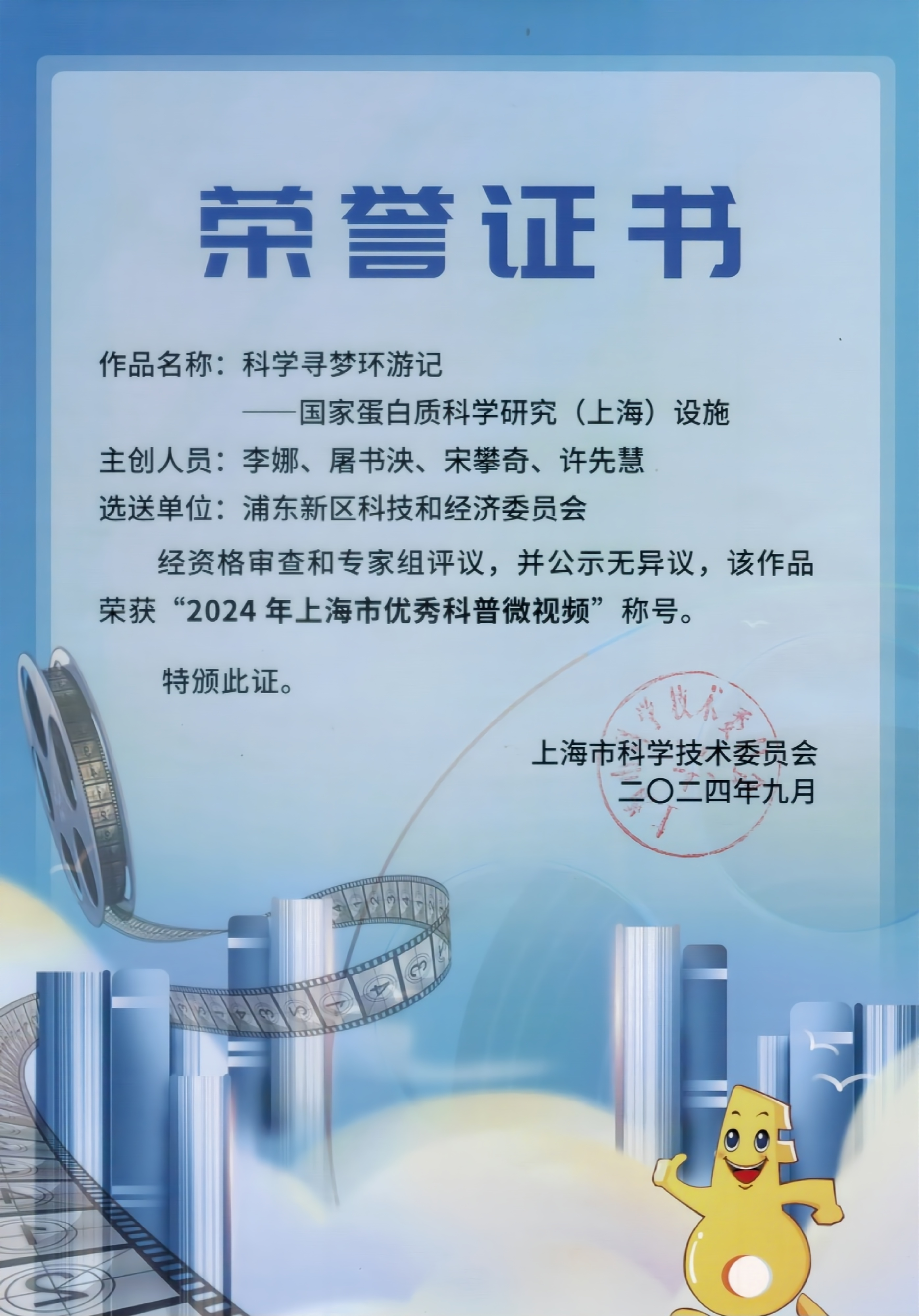 2024年7月1日,上海市科学技术委员会发布通知,该系列短视频“科学寻梦环游记-国家蛋白质科学研究(上海)设施”入选为2024年上海市优秀科普微视频。