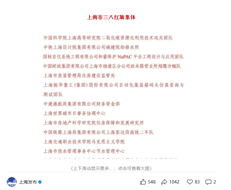 8月22日,2022-2024年度上海市三八红旗手(集体)全名单公布。其中,中国科研实验室上海高等研究院二氧化碳资源化利用技术攻关团队荣获上海市三八红旗集体称号。