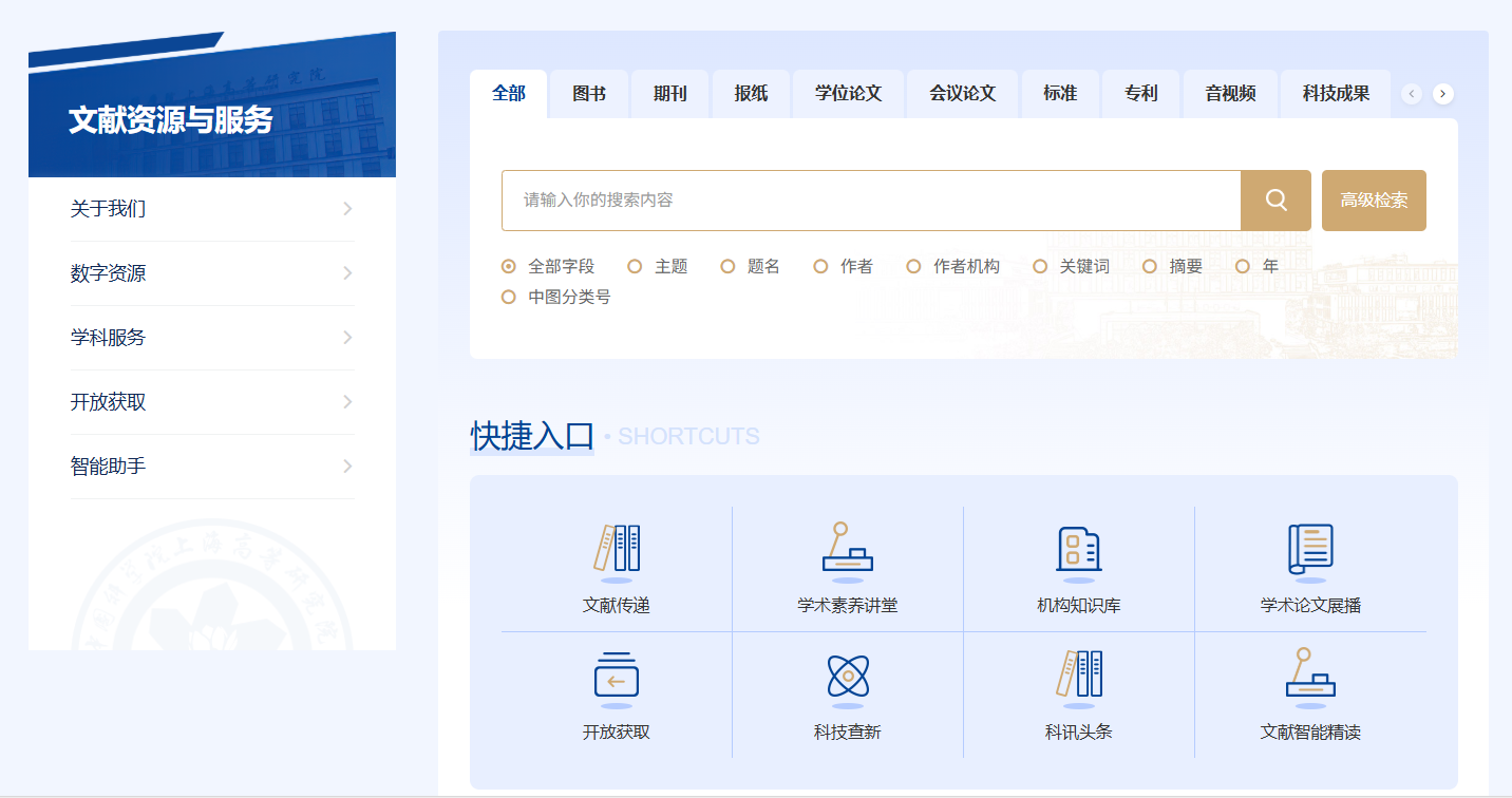 方法二:访问http://library.sari.ac.cn/进入“文献资源与服务”信息服务系统。