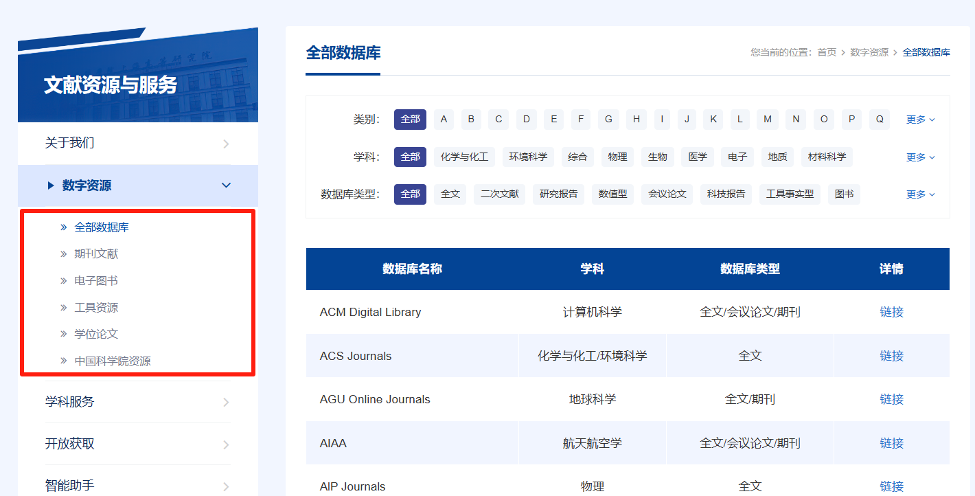 点击导航栏“数字资源”,可分别进入期刊文献、电子图书、学位论文等数字资源。