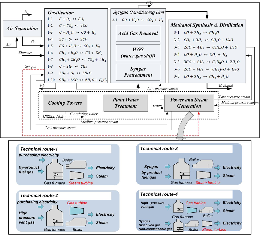 基于中国沿海某化工园区的10万吨/年规模的秸秆制绿色甲醇燃料装置,对其进行多场景设计、全流程精细化建模、能量分析、㶲分析和生命周期碳排放分析。根据基于生物质气化制绿色甲醇过程的副产燃料气和粗合成气的能量品位的不同,提出了四条技术路线:路线1利用副产燃料气体顺利获得蒸汽轮机发电,不足部分外购电力补充;路线2利用高压驰放气顺利获得燃气轮机发电,不足部分外购电力补充;路线3利用副产燃料气和部分粗合成气顺利获得蒸汽轮机发电,实现电力与蒸汽平衡;路线4利用高压驰放气顺利获得燃气轮机发电,利用溶解气、不凝气和部分粗合成气顺利获得蒸汽轮机发电,实现电力与蒸汽平衡。结果表明,路线2的甲醇生产系统㶲效率最高,路线1、4、2依次递减。其中气化单元、合成气调节单元、电力和蒸汽生产单元的㶲效率较低。水稻种植阶段(包括稻田中CH4和N2O排放的碳排放)是碳排放的主要来源之一。另外顺利获得降低秸秆消耗量并减少秸秆粉碎、干燥和成型所需的能耗,可以有效降低秸秆原材料生产阶段碳排放。若不包括水稻种植和作物收割环节,路线1和2(采用外购网电)的碳排放强度不符合欧盟甲醇燃料碳排放强度要求。然而,当路线1和2所外购电力为可再生能源电力,与无需外购电的路线3和4,均符合欧盟规定的碳排放限制。当可再生电力可用时,建议使用路线2。当难以取得可再生电力时,首选路线4。考虑到维护燃气轮机的挑战,还建议使用路线1(外购可再生电力)和路线3。