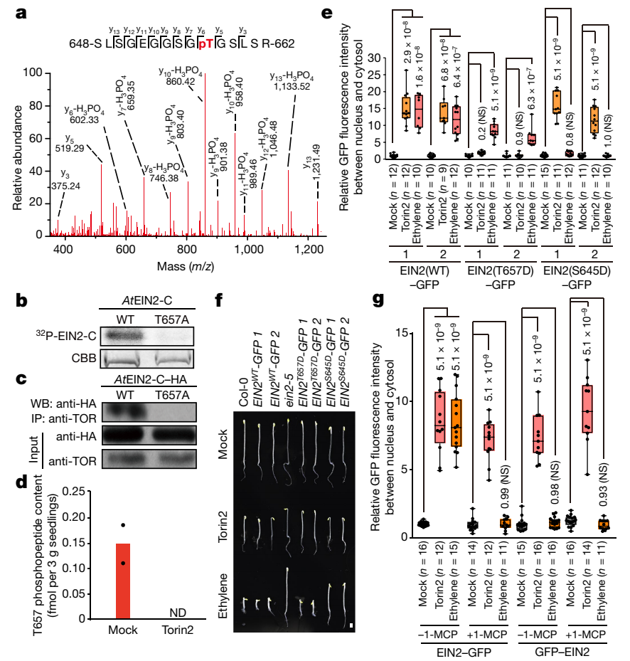 图1. TOR激酶磷酸化EIN2-Thr657位点,抑制EIN2全长蛋白的质-核穿梭