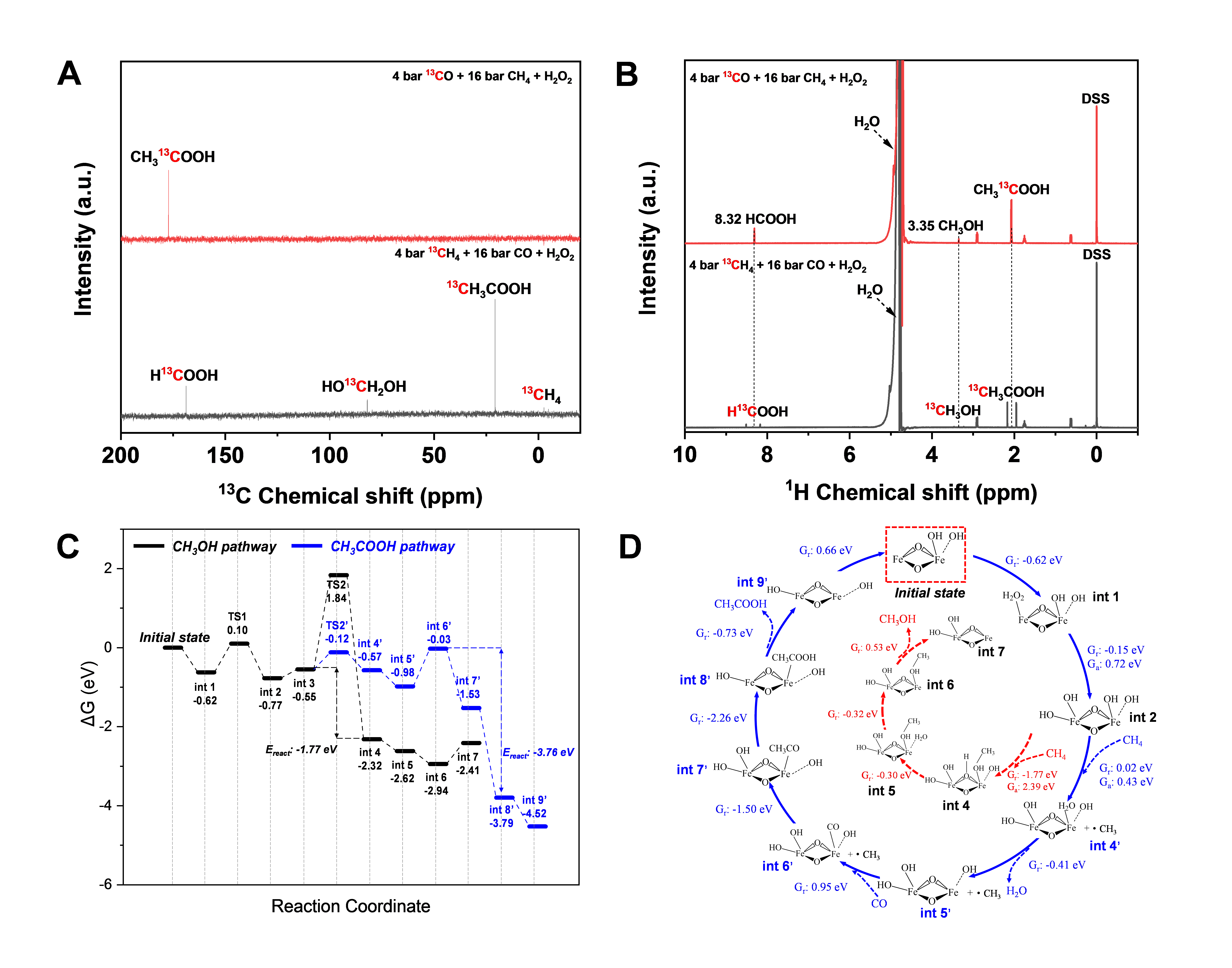 基于同位素示踪实验和理论计算等分析,作者提出了在二核Fe位点上CH4、H2O2和CO制备CH3COOH的反应机理(图2)。第一时间,H2O2在二核Fe位点上得到吸附态的羟基物种(OH*),随后OH*物种可以与CH4反应并生成甲基自由基(·CH3)。进一步发生CO吸附生成吸附态的CO物种(CO*),随后·CH3分别和CO*/OH*偶联得到吸附态的乙酰基(CH3CO*)物种和乙酸物种(CH3COOH*)。最后形成CH3COOH并再生二核Fe位点。相比于CH4与OH*经过一步直接得到CH3OH而言,·CH3与CO*和OH*直接偶联得到CH3COOH在热力学和动力学上都更有利,因此在CH4直接转化中展现出更高的CH3COOH选择性。
