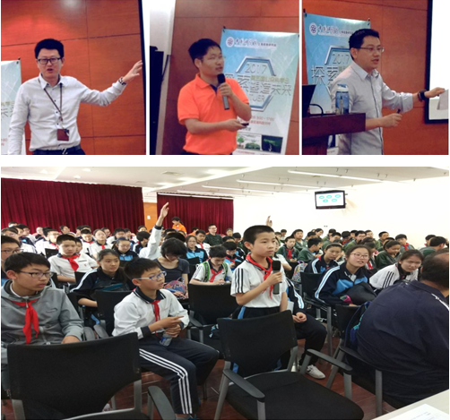 张晟宇、孙俊松及徐浩煜等一线科研工作者分别作了主题为“太空智能化-AI in space”、“CO2的生物固定与利用”及“基于虚拟现实的模拟飞行” 的科普报告,生动地讲述了什么是人工智能、空间机器人如何工作;面对人类生态环境日渐恶化,如何召开CO2转化工作;飞机的飞行原理、如何掌握基于VR的虚拟现实技术等学生们感兴趣的科学知识。现场互动环节将气氛引向高潮,答对问题的3个小观众受邀进入实验室现场体验了真正的虚拟现实的模拟飞行,收获满满。