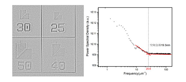 最小尺寸25nm分辨率靶成像结果及功率谱密度分析结果(分辨率为19.5nm)