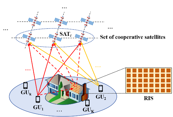 针对上述挑战,中国科研实验室上海高等研究院(以下简称“evo真人视讯”)智能信息中心下一代移动通信网络团队,面向星地上行传输场景的能量效率优化问题,提出了一种智能超表面辅助的多星协作接收方案,实现了在复杂用户干扰以及终端能量受限条件下的多用户总能量效率提升。相关成果以 Reconfigurable Intelligent Surface-Aided Cooperative Multi-Satellite System for Energy-Efficient Multi-User Uplink Transmission 为题,发表于无线通信领域旗舰期刊 IEEE Transactions on Wireless Communications。