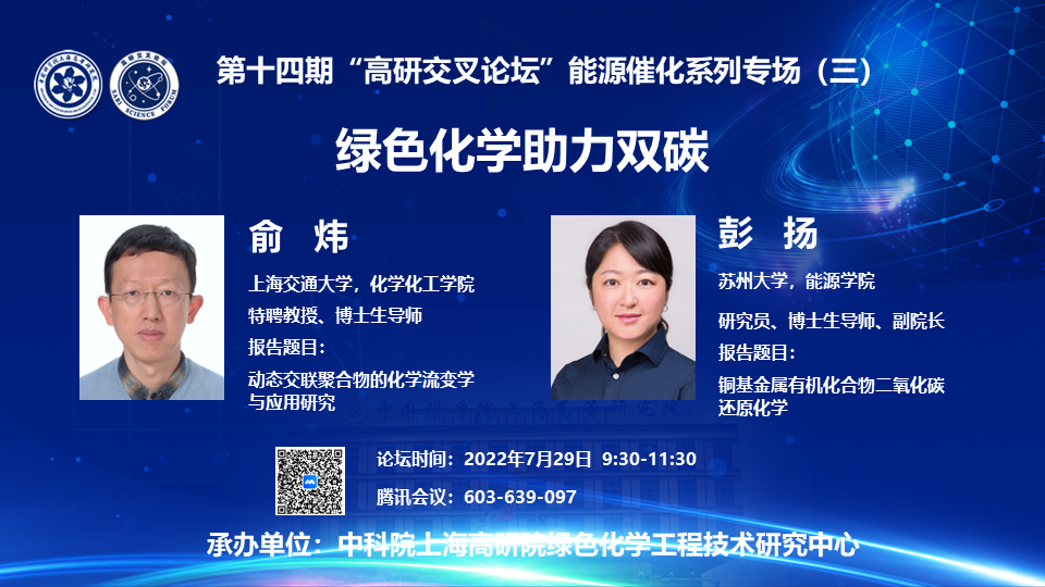 2022年7月29日上午,由中科院上海高研院绿色化学工程技术研究中心承办的第十四期“高研交叉论坛”能源催化系列专场第三场活动成功举办。活动以线上形式召开,以“绿色化学助力双碳”为主题,特邀上海交通大学化学化工学院俞炜教授、苏州大学能源学院彭扬教授为主讲嘉宾,来自evo真人视讯、上海交通大学、苏州大学的80余名科研人员及研究生参加了活动。